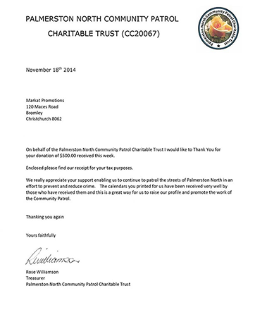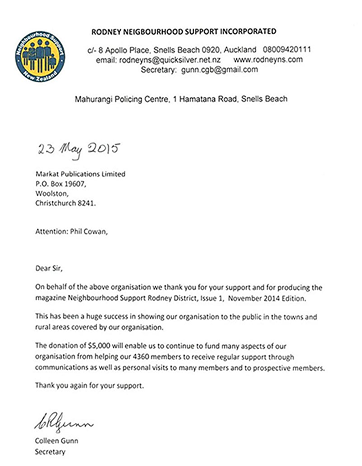 Otago Neighbourhood Support donation acknowledgment